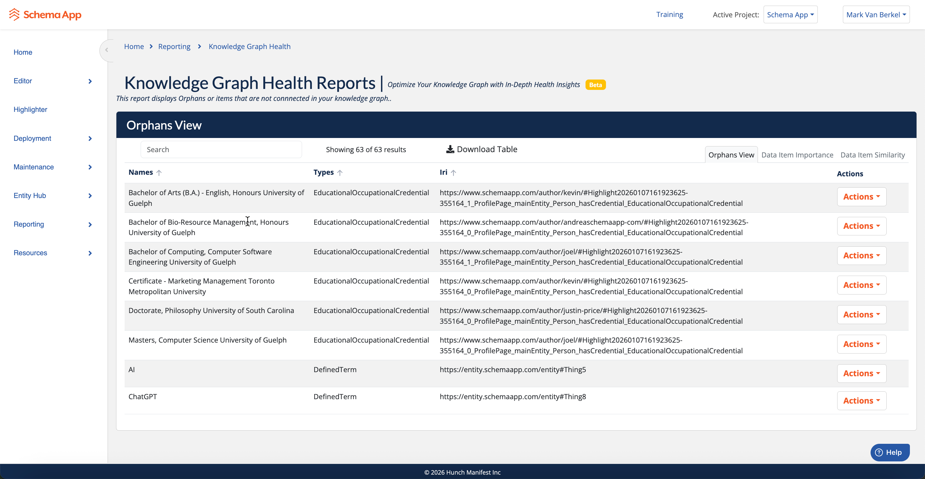 The Orphan Node Analysis report helps you identify items in your Knowledge Graph that are not connected to anything else. These “orphan” nodes weaken the overall quality, usefulness, and reliability of your graph. If an item has no relationships, it can’t contribute to entity understanding, content connections, or downstream insights like importance or similarity.